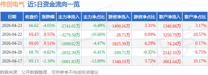 证券之星消息,截至2026年4月23日收盘,伟创电气(688698)报收于66.62元,下跌4.05%,换手率2.96%,成交量6.33万手,成交额4.23亿元。