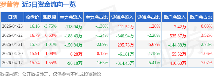 证券之星消息,截至2026年4月23日收盘,罗普特(688619)报收于16.16元,下跌3.75%,换手率2.88%,成交量5.34万手,成交额8744.29万元。