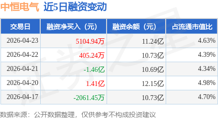证券之星消息,4月23日,中恒电气(002364)融资买入3.97亿元,融资偿还3.46亿元,融资净买入5104.94万元,融资余额11.24亿元,近20个交易日中有11个交易日出现融资净买入。