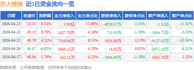 证券之星消息,截至2026年4月23日收盘,苏大维格(300331)报收于53.31元,上涨8.53%,换手率11.8%,成交量24.8万手,成交额12.77亿元。