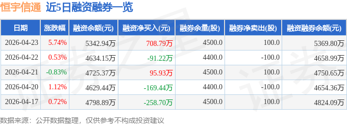 证券之星消息,截至2026年4月23日收盘,恒宇信通(300965)报收于59.7元,上涨5.74%,换手率5.38%,成交量2.91万手,成交额1.75亿元。