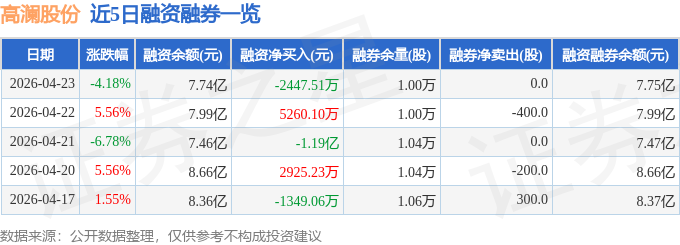 高澜股份融资融券信息显示,融资方面,当日融资买入1.34亿元,融资偿还1.58亿元,融资净偿还2447.51万元。融券方面,融券卖出0.0股,融券偿还0.0股,融券余量1.0万股,融券余额42.4万元。融资融券余额7.75亿元。