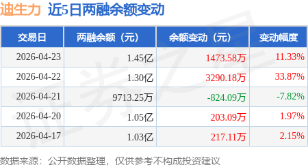 证券之星消息,4月23日,迪生力(603335)融资买入3707.18万元,融资偿还2233.59万元,融资净买入1473.59万元,融资余额1.45亿元。