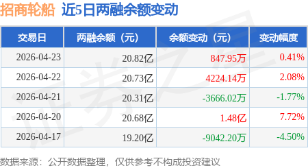 证券之星消息,4月23日,招商轮船(601872)融资买入2.75亿元,融资偿还2.64亿元,融资净买入1090.84万元,融资余额20.73亿元。