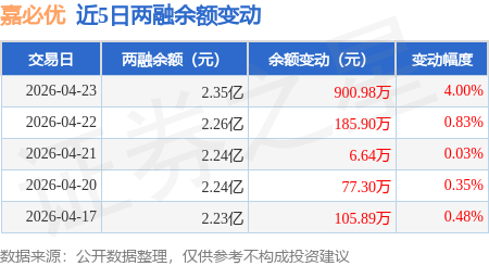 证券之星消息,4月23日,嘉必优(688089)融资买入4570.9万元,融资偿还3663.43万元,融资净买入907.47万元,融资余额2.34亿元,近20个交易日中有11个交易日出现融资净买入。