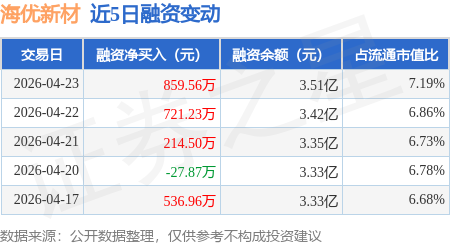 证券之星消息,4月23日,海优新材(688680)融资买入2442.67万元,融资偿还1583.11万元,融资净买入859.56万元,融资余额3.51亿元,近3个交易日已连续净买入累计1795.29万元,近20个交易日中有12个交易日出现融资净买入。