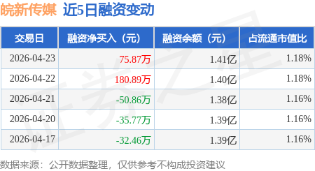 证券之星消息,4月23日,皖新传媒(601801)融资买入465.68万元,融资偿还389.8万元,融资净买入75.87万元,融资余额1.41亿元。
