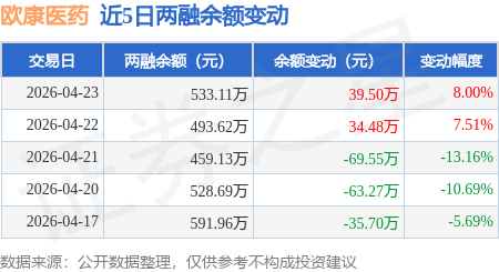 证券之星消息,4月23日,欧康医药(920230)融资买入152.04万元,融资偿还112.54万元,融资净买入39.5万元,融资余额533.11万元。