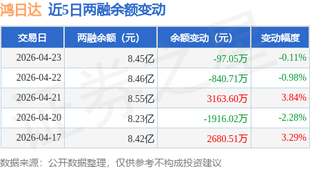 证券之星消息,4月23日,鸿日达(301285)融资买入3335.83万元,融资偿还3432.88万元,融资净卖出97.05万元,融资余额8.45亿元,近20个交易日中有11个交易日出现融资净买入。
