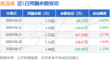 证券之星消息,4月23日,奥迪威(920491)融资买入788.02万元,融资偿还887.37万元,融资净卖出99.35万元,融资余额1.53亿元,近20个交易日中有13个交易日出现融资净买入。