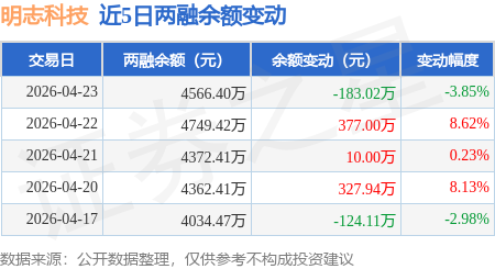 证券之星消息,4月23日,明志科技(688355)融资买入868.63万元,融资偿还1051.65万元,融资净卖出183.02万元,融资余额4566.4万元。