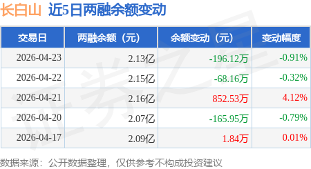 证券之星消息,4月23日,长白山(603099)融资买入1197.8万元,融资偿还1387.83万元,融资净卖出190.04万元,融资余额2.12亿元,近20个交易日中有11个交易日出现融资净买入。