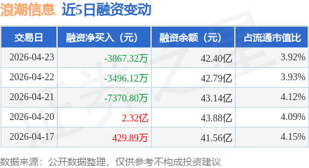 证券之星消息,4月23日,浪潮信息(000977)融资买入4.82亿元,融资偿还5.2亿元,融资净卖出3867.32万元,融资余额42.4亿元。