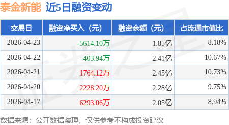 证券之星消息,4月23日,泰金新能(688813)融资买入7084.88万元,融资偿还1.27亿元,融资净卖出5614.1万元,融资余额1.85亿元。