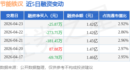 证券之星消息,4月23日,节能铁汉(300197)融资买入488.69万元,融资偿还514.56万元,融资净卖出25.87万元,融资余额1.42亿元。