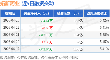 证券之星消息,4月23日,拓新药业(301089)融资买入440.99万元,融资偿还745.6万元,融资净卖出304.61万元,融资余额1.32亿元。