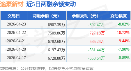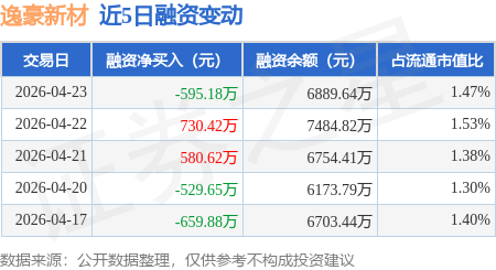 证券之星消息,4月23日,逸豪新材(301176)融资买入1282.44万元,融资偿还1877.63万元,融资净卖出595.18万元,融资余额6889.64万元。