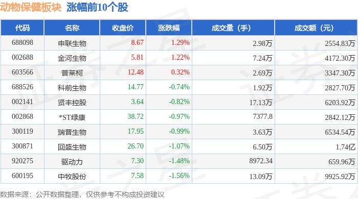 证券之星消息,4月24日动物保健板块较上一交易日下跌0.84%,大禹生物领跌。当日上证指数报收于4079.9,下跌0.33%。深证成指报收于14940.3,下跌0.69%。动物保健板块个股涨跌见下表: