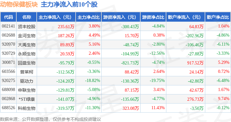 从资金流向上来看,当日动物保健板块主力资金净流出7613.36万元,游资资金净流入1814.35万元,散户资金净流入5799.01万元。动物保健板块个股资金流向见下表: