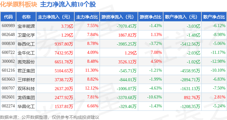 从资金流向上来看,当日化学原料板块主力资金净流入6.54亿元,游资资金净流入8829.47万元,散户资金净流出7.43亿元。化学原料板块个股资金流向见下表:
