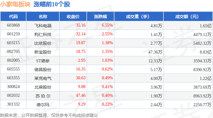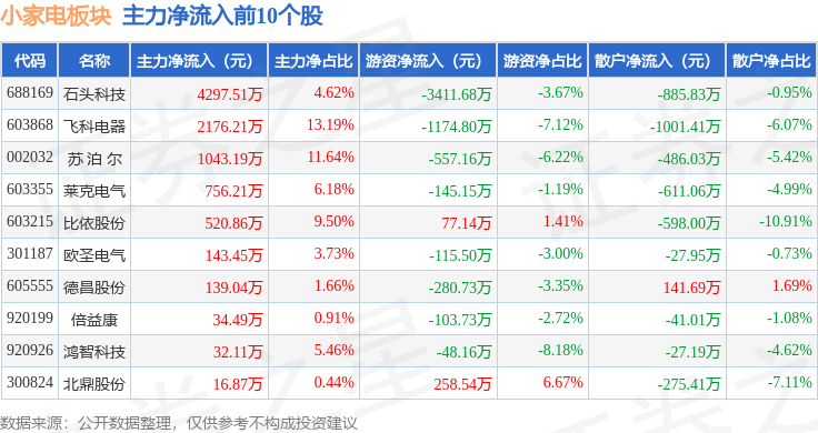 从资金流向上来看,当日小家电板块主力资金净流出498.99万元,游资资金净流出8004.25万元,散户资金净流入8503.24万元。小家电板块个股资金流向见下表:
