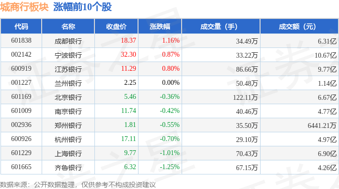 证券之星消息,4月24日城商行板块较上一交易日下跌0.22%,厦门银行领跌。当日上证指数报收于4079.9,下跌0.33%。深证成指报收于14940.3,下跌0.69%。城商行板块个股涨跌见下表: