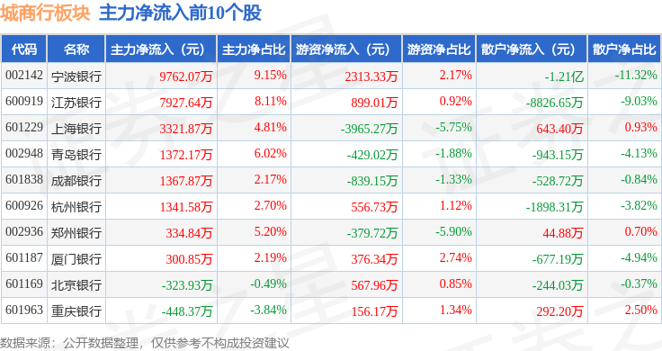 从资金流向上来看,当日城商行板块主力资金净流入1.34亿元,游资资金净流入5680.76万元,散户资金净流出1.91亿元。城商行板块个股资金流向见下表: