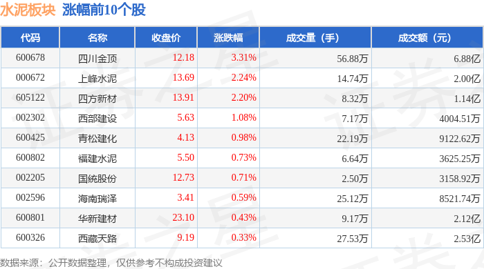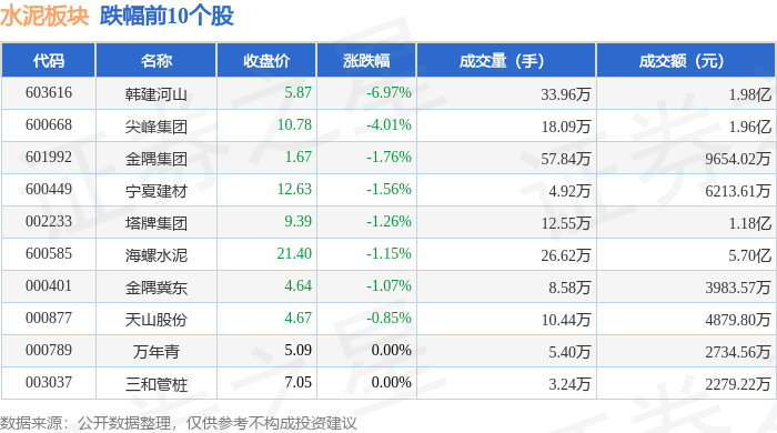 证券之星消息,4月24日水泥板块较上一交易日下跌0.52%,韩建河山领跌。当日上证指数报收于4079.9,下跌0.33%。深证成指报收于14940.3,下跌0.69%。水泥板块个股涨跌见下表: