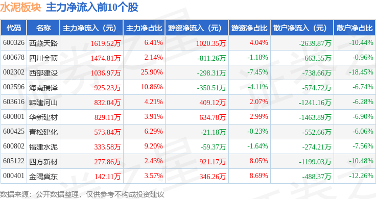 从资金流向上来看,当日水泥板块主力资金净流出2486.46万元,游资资金净流入3180.39万元,散户资金净流出693.94万元。水泥板块个股资金流向见下表: