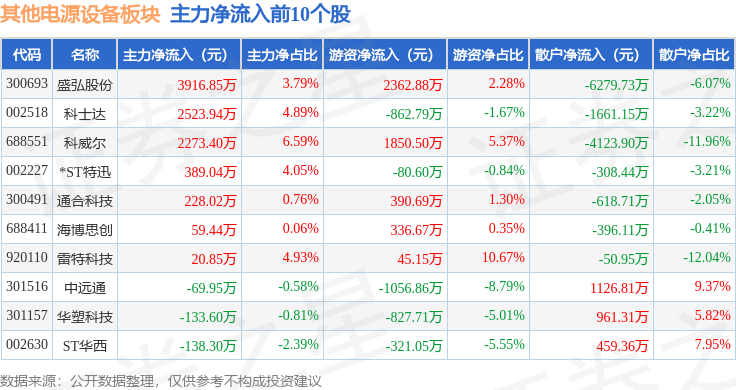 从资金流向上来看,当日其他电源设备板块主力资金净流出15.71亿元,游资资金净流入7664.11万元,散户资金净流入14.95亿元。其他电源设备板块个股资金流向见下表: