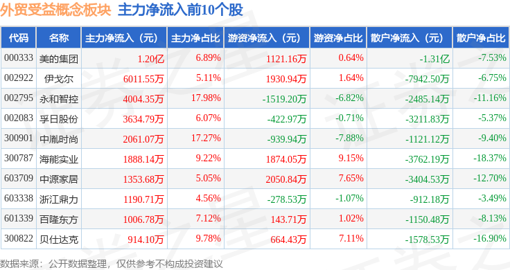 从资金流向上来看,当日外贸受益概念板块主力资金净流出5.89亿元,游资资金净流入2.84亿元,散户资金净流入3.05亿元。外贸受益概念板块个股资金流向见下表: