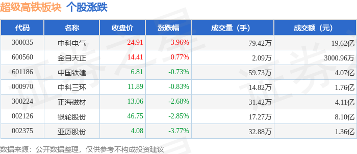 证券之星消息,4月24日超级高铁板块较上一交易日下跌1.05%,亚厦股份领跌。当日上证指数报收于4079.9,下跌0.33%。深证成指报收于14940.3,下跌0.69%。超级高铁板块个股涨跌见下表: