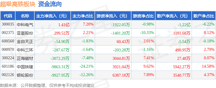 从资金流向上来看,当日超级高铁板块主力资金净流出8773.01万元,游资资金净流入9886.94万元,散户资金净流出1113.93万元。超级高铁板块个股资金流向见下表: