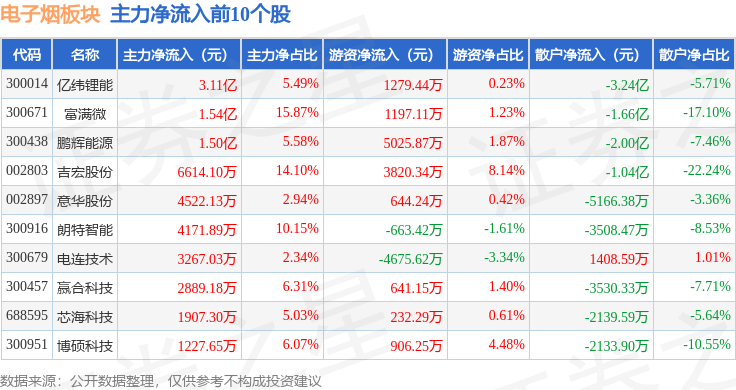 从资金流向上来看,当日电子烟板块主力资金净流出15.73亿元,游资资金净流出9846.48万元,散户资金净流入16.71亿元。电子烟板块个股资金流向见下表:
