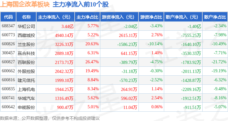 从资金流向上来看,当日上海国企改革板块主力资金净流出3.79亿元,游资资金净流出8709.44万元,散户资金净流入4.66亿元。上海国企改革板块个股资金流向见下表: