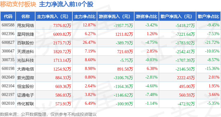 从资金流向上来看,当日移动支付板块主力资金净流出19.66亿元,游资资金净流入5.55亿元,散户资金净流入14.11亿元。移动支付板块个股资金流向见下表: