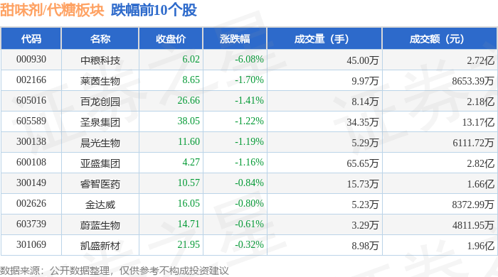 证券之星消息,4月24日甜味剂/代糖板块较上一交易日下跌0.43%,中粮科技领跌。当日上证指数报收于4079.9,下跌0.33%。深证成指报收于14940.3,下跌0.69%。甜味剂/代糖板块个股涨跌见下表: