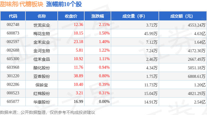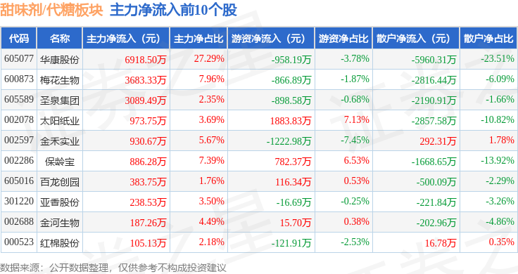 从资金流向上来看,当日甜味剂/代糖板块主力资金净流入5451.78万元,游资资金净流入821.71万元,散户资金净流出6273.49万元。甜味剂/代糖板块个股资金流向见下表: