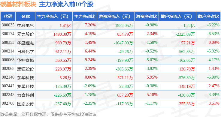 从资金流向上来看,当日碳基材料板块主力资金净流出9.97亿元,游资资金净流出1776.83万元,散户资金净流入10.15亿元。碳基材料板块个股资金流向见下表: