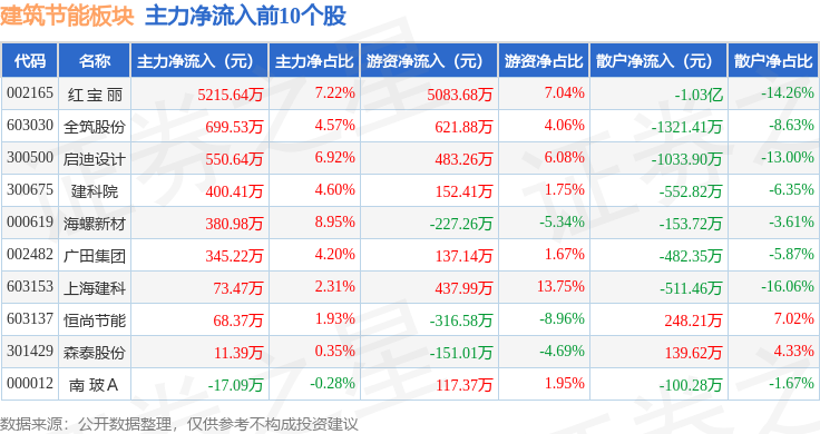 从资金流向上来看,当日建筑节能板块主力资金净流出3.0亿元,游资资金净流入8553.0万元,散户资金净流入2.14亿元。建筑节能板块个股资金流向见下表: