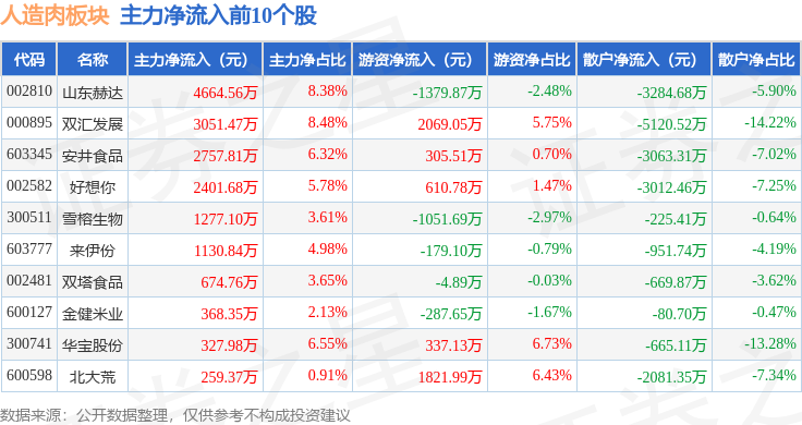 从资金流向上来看,当日人造肉板块主力资金净流出1.94亿元,游资资金净流出14.55万元,散户资金净流入1.94亿元。人造肉板块个股资金流向见下表: