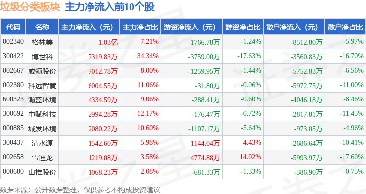 从资金流向上来看,当日垃圾分类板块主力资金净流出1.06亿元,游资资金净流出238.44万元,散户资金净流入1.09亿元。垃圾分类板块个股资金流向见下表: