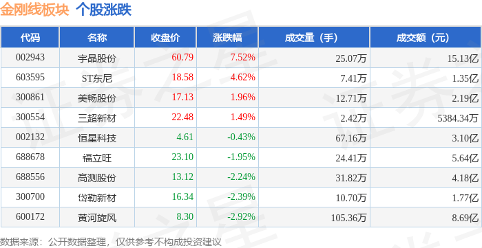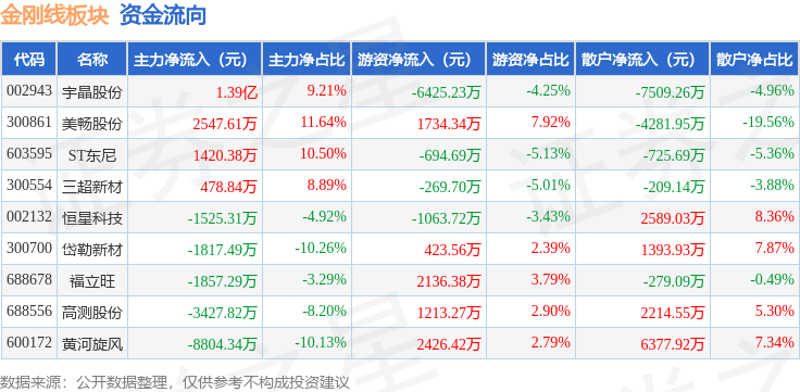 从资金流向上来看,当日金刚线板块主力资金净流入949.08万元,游资资金净流出519.37万元,散户资金净流出429.71万元。金刚线板块个股资金流向见下表: