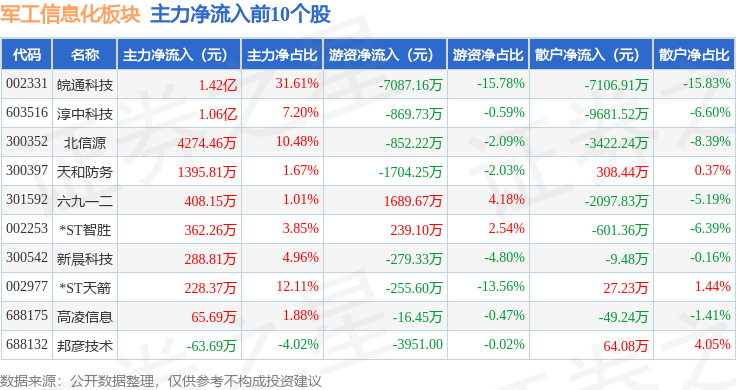 从资金流向上来看,当日军工信息化板块主力资金净流出10.84亿元,游资资金净流出2.22亿元,散户资金净流入13.06亿元。军工信息化板块个股资金流向见下表: