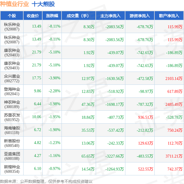 个股表现方面,种植业行业当日领跌股为秋乐种业(920087),该股当日报收13.49,下跌8.11%,成交量8.3万,主力资金净流出2083.56万元。秋乐种业(920087)以下跌8.11%紧随其后,该股当日成交量8.3万,主力资金净流出2083.56万元。除此之外,康农种业(920403)、康农种业(920403)、众兴菌业(002772)均进入当日熊股之列。具体个股列表见下表: