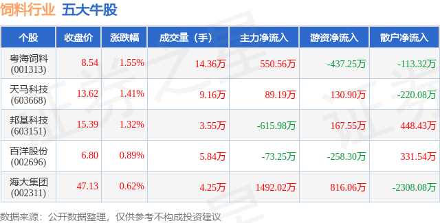 个股表现方面,饲料行业当日领涨股为粤海饲料(001313),该股当日报收8.54,上涨1.55%,成交量14.36万,主力资金净流入550.56万元。天马科技(603668)以上涨1.41%紧随其后,该股当日成交量9.16万,主力资金净流入89.19万元。除此之外,邦基科技(603151)、百洋股份(002696)、海大集团(002311)均进入当日牛股之列。具体个股列表见下表: