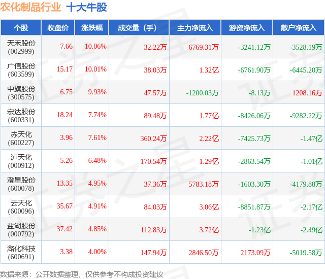 个股表现方面,农化制品行业当日领涨股为天禾股份(002999),该股当日报收7.66,上涨10.06%,成交量32.22万,主力资金净流入6769.31万元。广信股份(603599)以上涨10.01%紧随其后,该股当日成交量38.03万,主力资金净流入1.32亿元。除此之外,中旗股份(300575)、宏达股份(600331)、赤天化(600227)均进入当日牛股之列。具体个股列表见下表: