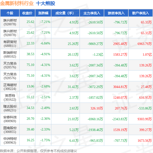 个股表现方面,金属新材料行业当日领跌股为族兴新材(920078),该股当日报收25.62,下跌7.21%,成交量4.93万,主力资金净流出2610.5万元。族兴新材(920078)以下跌7.21%紧随其后,该股当日成交量4.93万,主力资金净流出2610.5万元。除此之外,有研复材(688811)、斯瑞新材(688102)、天力复合(920576)均进入当日熊股之列。具体个股列表见下表: