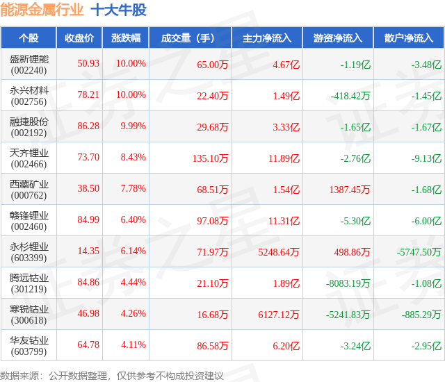 个股表现方面,能源金属行业当日领涨股为盛新锂能(002240),该股当日报收50.93,上涨10.0%,成交量65.0万,主力资金净流入4.67亿元。永兴材料(002756)以上涨10.0%紧随其后,该股当日成交量22.4万,主力资金净流入1.49亿元。除此之外,融捷股份(002192)、天齐锂业(002466)、西藏矿业(000762)均进入当日牛股之列。具体个股列表见下表: