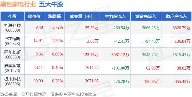 个股表现方面,黑色家电行业当日领涨股为九联科技(688609),该股当日报收9.48,上涨1.72%,成交量25.29万,主力资金净流出260.54万元。*ST高斯(002848)以上涨1.29%紧随其后,该股当日成交量3.63万,主力资金净流出42.41万元。除此之外,四川长虹(600839)、辰奕智能(301578)、极米科技(688696)均进入当日牛股之列。具体个股列表见下表: